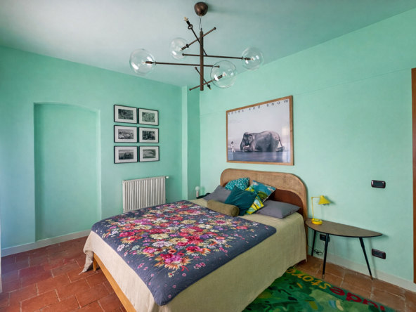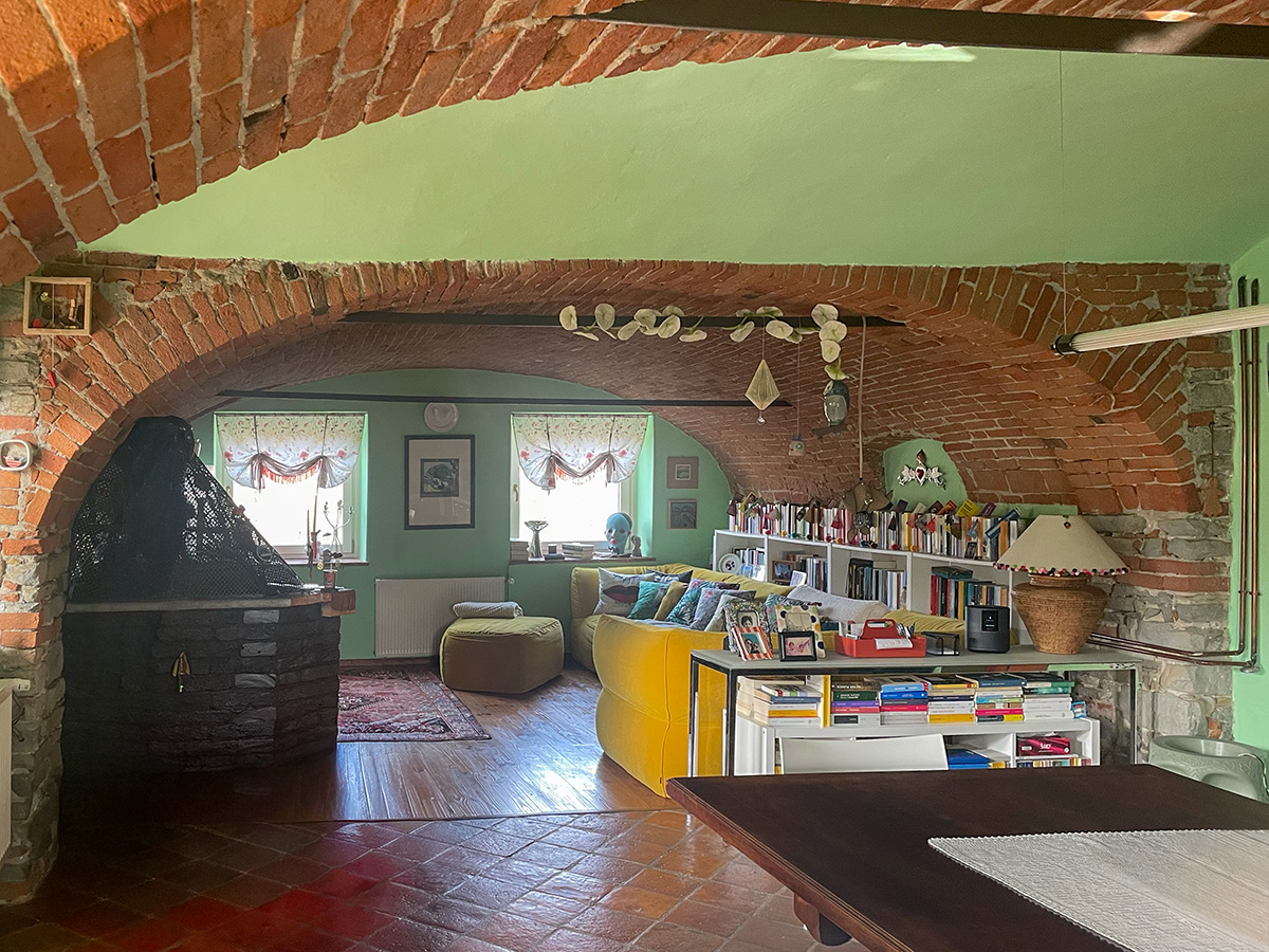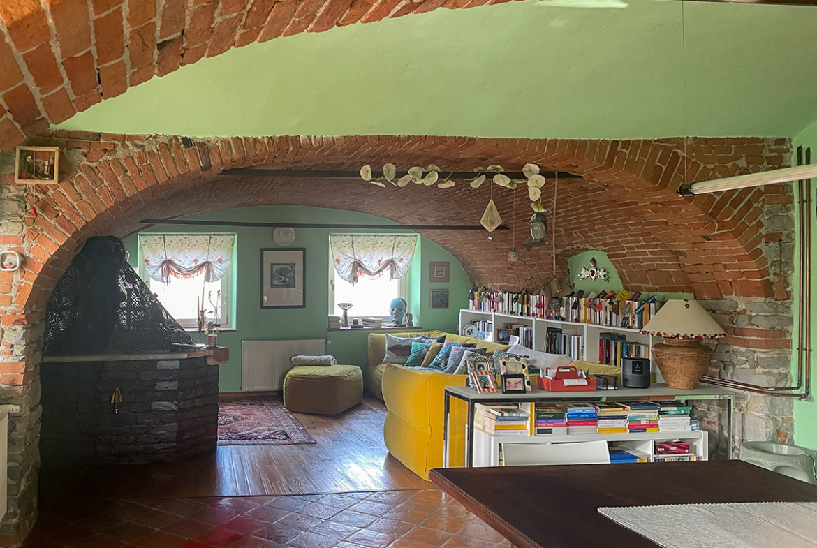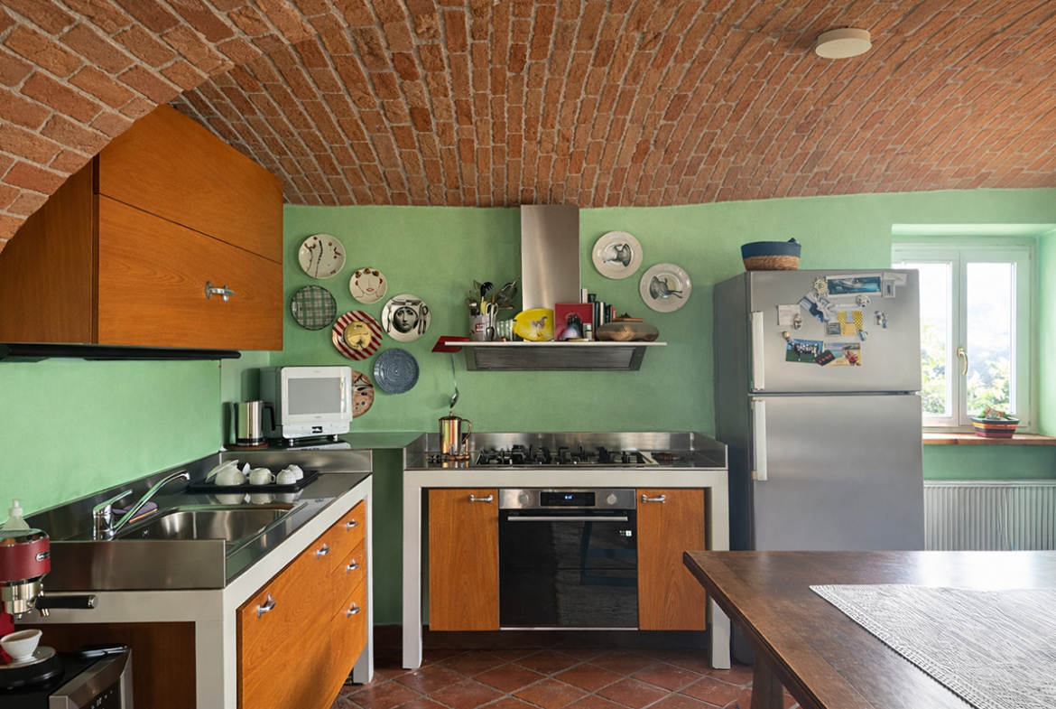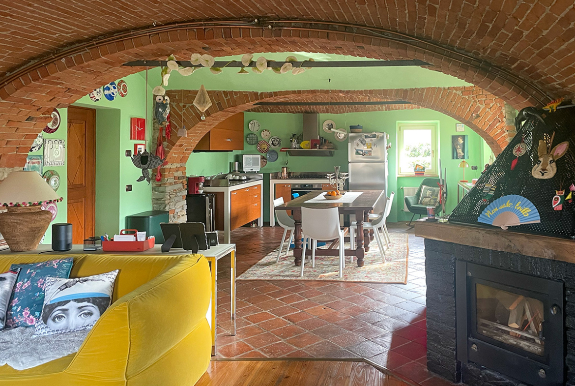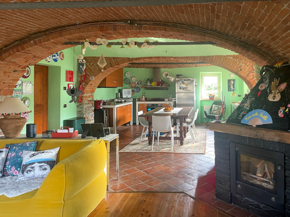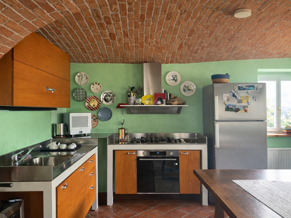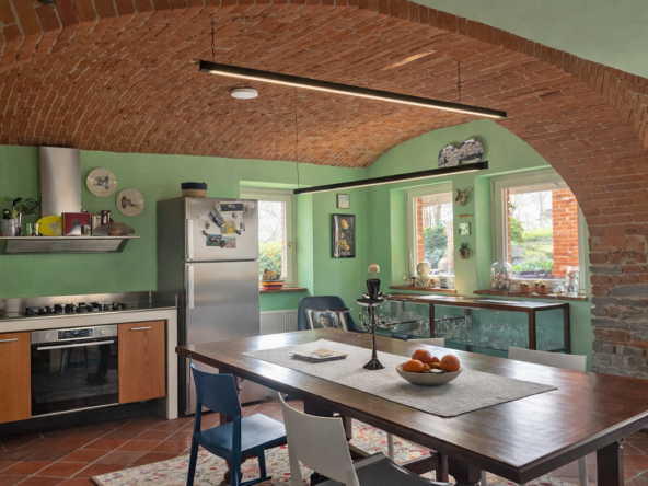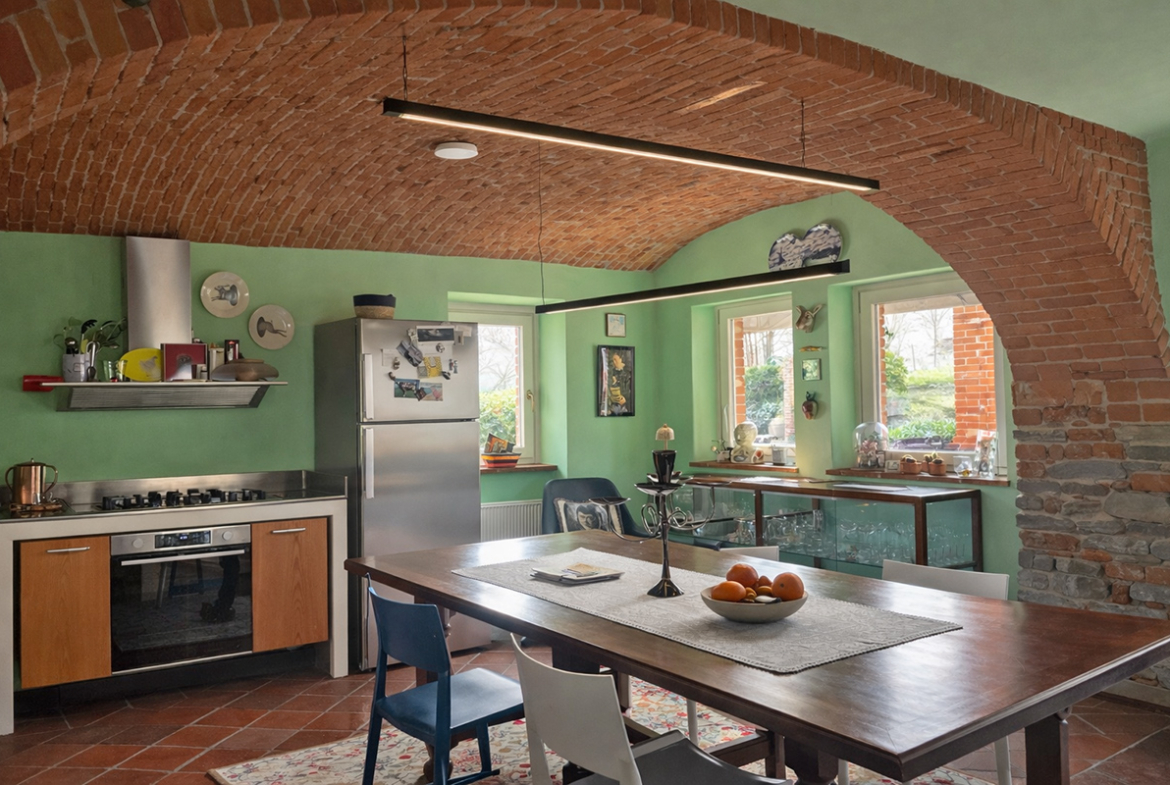 Il cuore della casa è un’eccezionale zona giorno openspace con cucina e sala da pranzo, caratterizzata da un suggestivo soffitto a volta con archi in mattoni a vista, un elemento architettonico di spicco che crea uno spazio caldo e suggestivo.