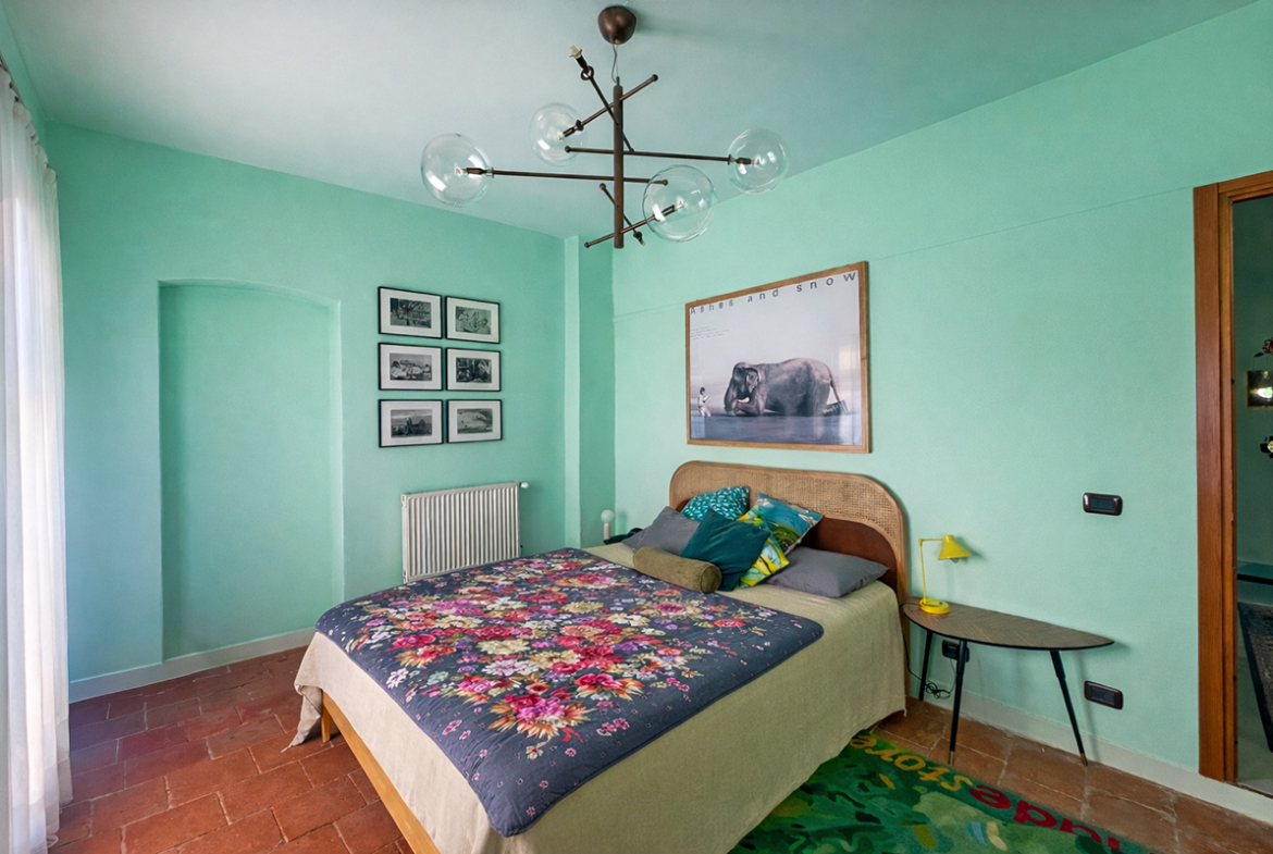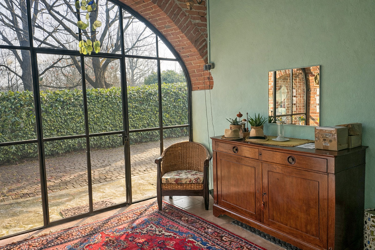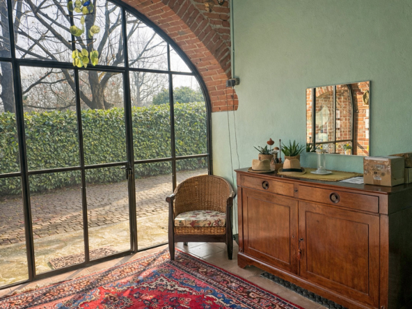 Al piano terra si trovano anche un bagno di servizio e una stanza elegantemente rifinita, attualmente adibita a lavanderia, che si distingue per un’ampia finestra ad arco con telaio in metallo che inonda l’ambiente di luce naturale.
